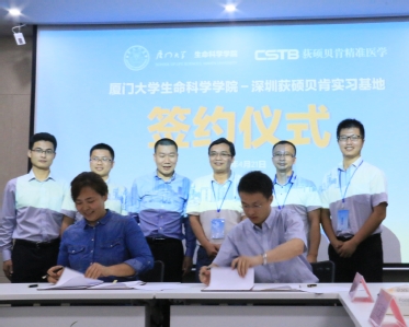 4月21日下午书院一行人乘车抵达位于深圳市大鹏新区的荻硕贝肯公司。深圳荻硕贝肯精准医学有限公司总裁、厦门大学生命科学学院在读博士郑仲征先生,生物信息中心主任叶纬博士、生物中心主任安琳博士等出席本次实习实训基地签约仪式。仪式由公司首席运营官张泽龙主持。仪式开始,郑仲征先生对厦大师生的到来表示欢迎。紧接着他对公司进行了简要的介绍。深圳荻硕贝肯精准医学有限公司是一家是致力于同种异体组织材料与免疫遗传领域的研发、技术转化、产品开发为一体的专业化高新技术公司。然后,他通过自身的经历,深入浅出的从公司发展历程、公司主营项目、公司研究方向等方面进行了介绍,同时举例说明公司目前拥有的各项专利在精准医学上的不同应用以加深同学们的理解。他同时强调,虽然生物专业现在不被一些人看好,但是他坚信21世纪最终还是生物世纪,他希望学弟学妹坚持梦想,成为我国生命科学的领军人才。左正宏副书记代表博伊特勒书院致辞,他指出:同学们一定要珍惜本次外出机会,与公司的在职人员进行深入的交流,了解现在生物行业发展的盛景,树立远大的理想,为以后的就业择业夯实基础。