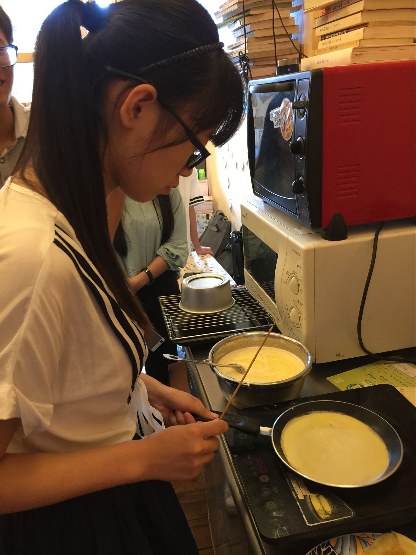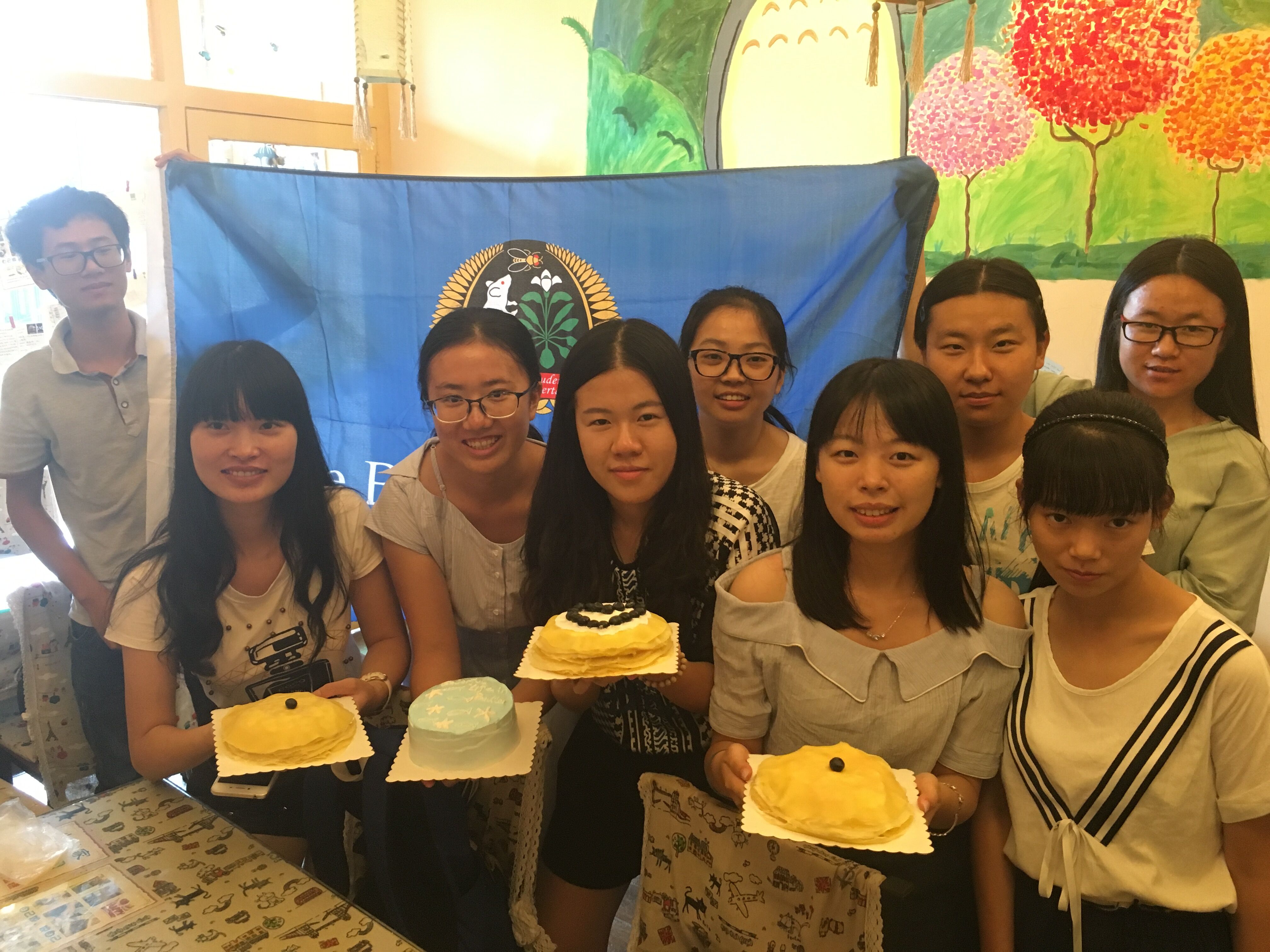 很快,一行人到达了厦大西村的蛋糕店,看到我们的到来,老板便开始准备各种食材,奶油,牛奶,黄油,面粉,芒果,蓝莓,火龙果,小店虽小却布置地非常温馨。短暂的等待后,大家就开始迫不及待的制作蛋糕的饼底,白糖,面粉,鸡蛋,每一项都是经过准确称量后充分搅拌,放入烤箱。与此同时,芒果千层和蓝莓千层也开始制作,配好原料后,同学们开始轮流摊饼皮,有的火候刚刚好,有的却发出了焦糊的味道,可是每个人的技艺都随着每一次的成功或失败一步步的渐渐娴熟。此时,一旁的蛋糕也散发出了诱人的味道,等到饼底冷却后,切成三层,在每一层中间加上打好的奶油和火龙果块,最后的一层铺上了蓝色的奶油,点缀了海星和一条条小鱼,最后还在蛋糕上面写了“colorful life in Beutler”几个字,来表达大家在书院的大一生活的结束和因为加入书院所带来的独特体验。