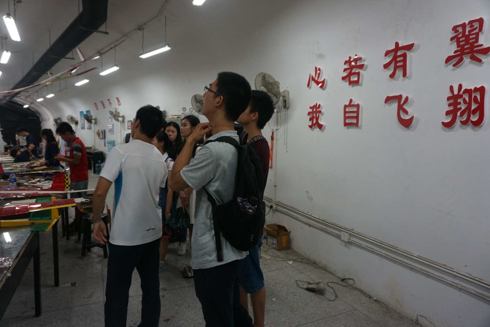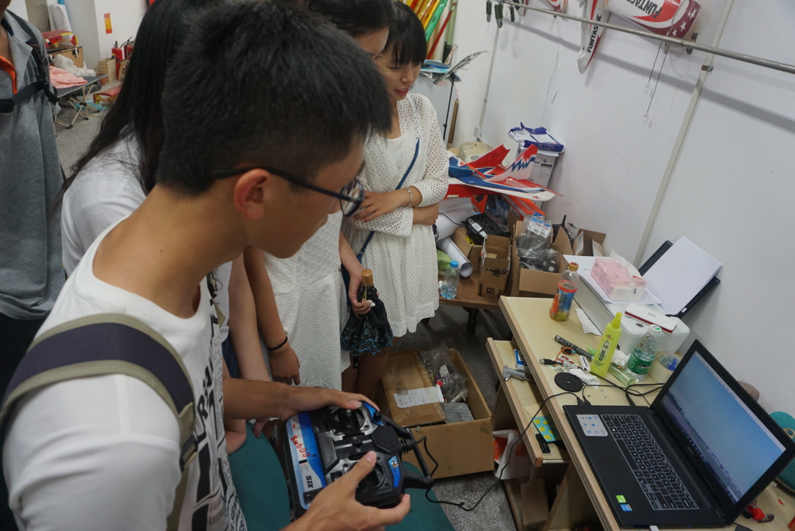 观看了航模队的试飞表演之后,在刘震学长和江子扬辅导员的带领下,同学们来到位于芙蓉隧道8号洞的航模基地进行参观。基地规模不大,成长条状,但其中各式设备应有尽有。走进基地,首先映入眼帘的是几台大型加工机械。“我们引进了激光切割机和一些零件加工机器。”刘震学长介绍到,“无人机的各种材料都需要我们自己制作完成。所以我们也必须掌握一定的机械技能。”逐渐深入,同学们立刻被陈列的各式无人机所吸引。在观看了航模队的比赛宣传片之后,刘震学长向同学们展示了模拟飞行的电脑软件,并细致地讲解了无人机的操纵方法和降落的注意事项。“现今虽然无人机飞行完全由软件系统控制,但为求万无一失,每一次飞行往往会配备一名人工操纵员。当软件系统出故障后,操纵员会第一时间接手进行控制。”刘震学长说道。在刘震学长示范之后,同学们跃跃欲试,纷纷当起了无人机操纵员。在尝试到操纵的乐趣之余,同学们也体会了操纵无人机的不易。
