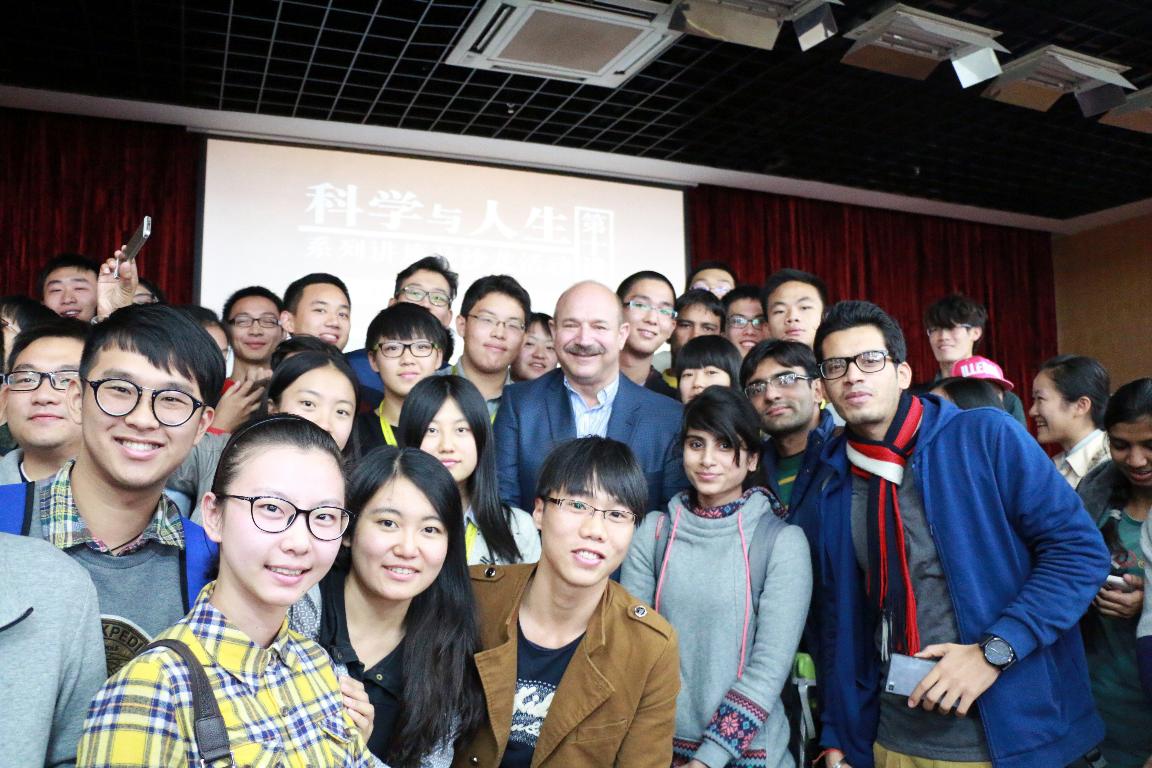 在随后的互动讨论环节中,同学们踊跃发问,提出了关于怎样平衡时间,影响一生的转折点,获奖后的计划等一系列问题,博伊特勒教授都进行了耐心细致的解答,并重点指出在科学研究中兴趣,创新,勤学好问,以及失败之后永不言弃的重要性。讲座结束后,许多同学纷纷走到讲台与博伊特勒教授交流并合影留念。
